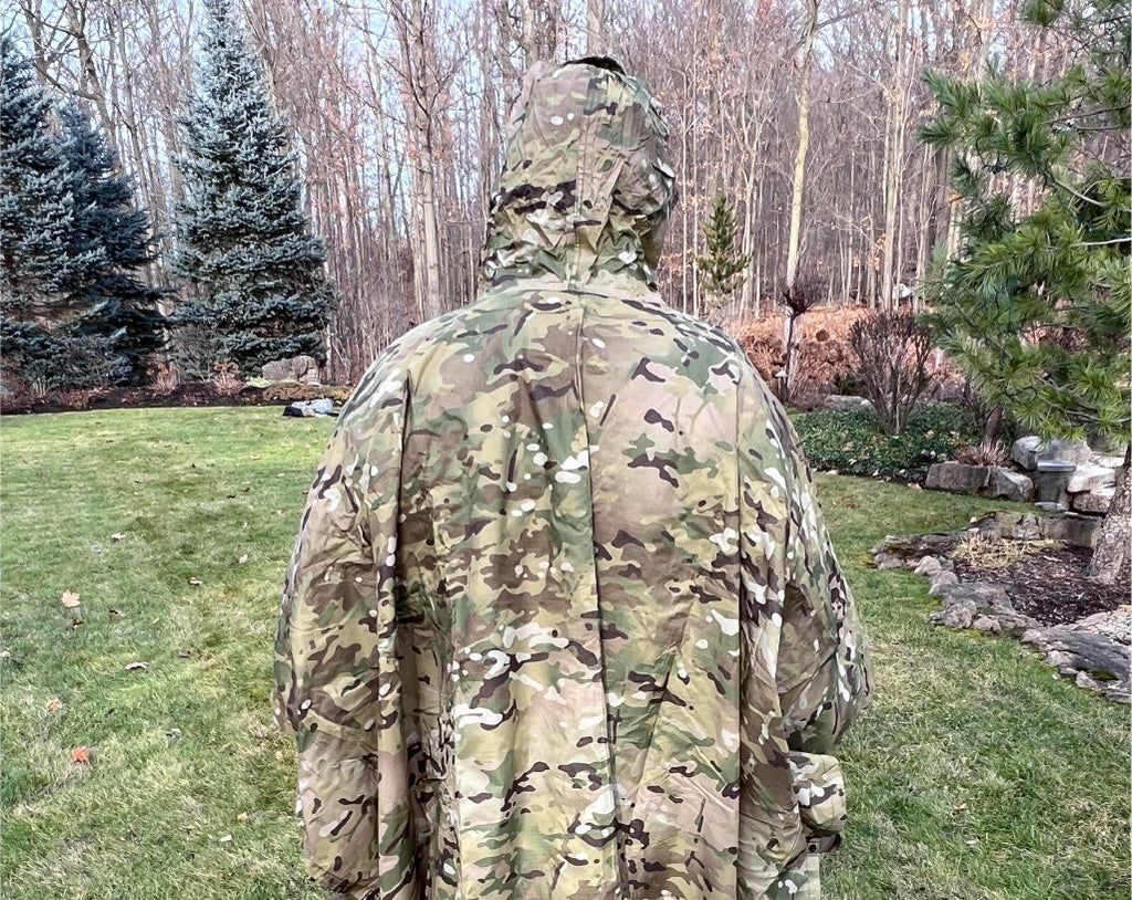 12 lightweight tie out loops, 6 button snaps on the side seam and corners for creating armholes and side coverage, shock-corded bottom edge to draw around a backpack, wide brimmed hood with a shock cord.